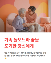 아픈 가족을 돌보느라 학업과 진로를 포기해야 했던 9세~39세 청소년·청년들을 위한 서울시 가족돌봄청년지원 사업! 생계비, 학습비, 의료비는 물론 공공주택까지 지원받을 수 있다는 사실, 알고 계셨나요?