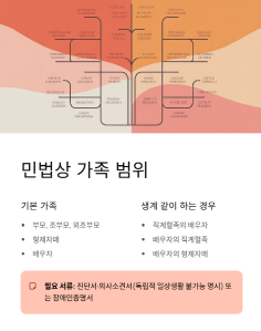 민법상 가족의 범위는 부모, 조부모, 외조부모 등의 직계혈족과 형제자매, 배우자를 포함해요. 생계를 같이 하는 경우 직계혈족의 배우자, 배우자의 직계혈족 및 형제자매까지 포함되니 꽤 넓은 편이에요.