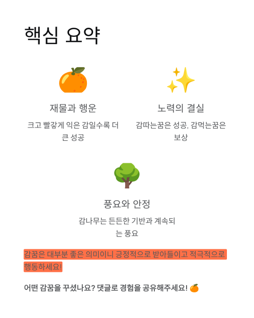 감이 떨어지거나 썩었다면 기회를 놓칠 수 있고, 떫은 감은 조금 더 기다려야 한다는 신호예요. 감꿈은 대부분 좋은 의미이니 긍정적으로 받아들이고, 적극적으로 행동하면 더 큰 성공을 거둘 수 있어요!