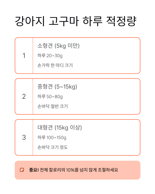 하루 적정량은 체중별로 다르며, 전체 칼로리의 10%를 넘지 않게 조절하세요. 생고구마는 피하고 반드시 삶거나 쪄서 식힌 후에 급여해야 합니다.