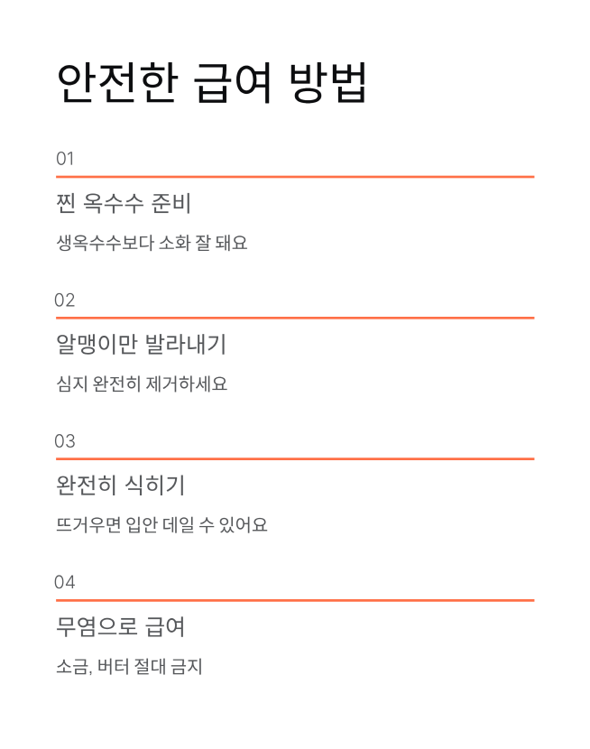 하지만 주의할 점이 있어요. 옥수수 심지(옥수수 속대)는 절대 주면 안 됩니다. 이건 정말 위험해요. 알맹이만 깨끗하게 발라서 소량씩 주는 게 안전합니다.