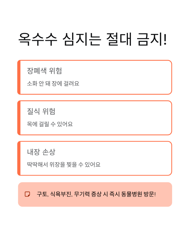 하지만 옥수수 심지는 절대 금지! 장폐색, 질식, 내장 손상 등 치명적인 위험이 있습니다. 심지는 강아지가 절대 닿지 못하게 관리하세요.