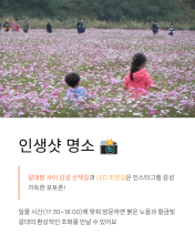 그리고 인스타그램 감성 가득한 포토존은 절대 놓치지 마세요! 특히 갈대밭 사이를 걷는 ‘감성 산책길’과 LED 조명길은 인생샷 명소로 이미 소문났답니다 💡