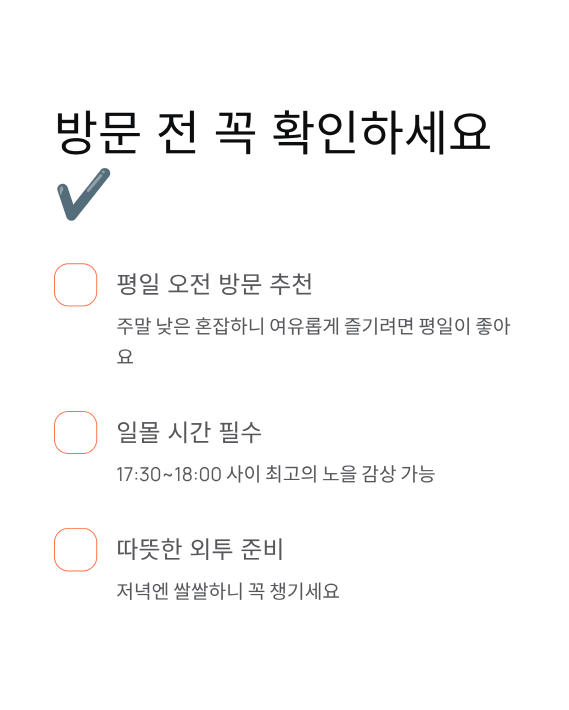 - 일몰 시간(17:30~18:00)에 맞춰 가면 최고의 노을을 감상할 수 있어요