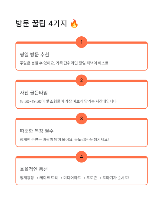 청계광장 → 케이크 트리 → 미디어아트 구간 → 포토존 → 꼬마기차 코스로 돌면 효율적이에요.
