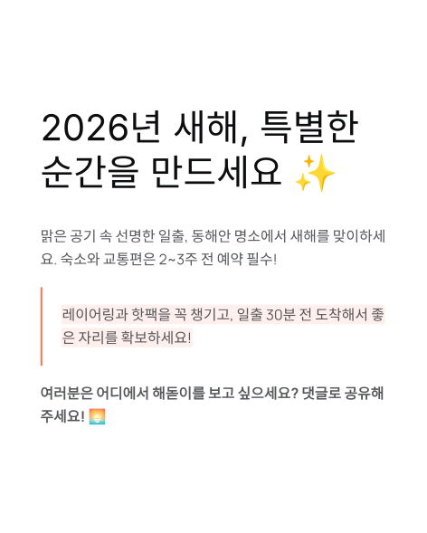 여러분은 어디에서 해돋이를 보고 싶으세요? 추천하는 명소나 경험담을 댓글로 공유해 주세요! 🌅 공감도 꾹!