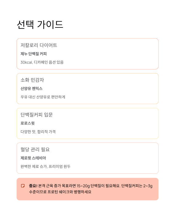 하지만 가벼운 간식 대용이나 아침 식사 보충, 일상적인 단백질 섭취 목적이라면 단백질커피가 딱이에요! 선택할 때는 칼로리와 당류를 꼭 체크하세요. 다이어트 중이라면 저칼로리, 제로 슈가 제품이 필수고요. 맛도 중요한데, 아메리카노 스타일을 좋아하시는지 라떼 스타일을 좋아하시는지에 따라 제품이 달라져요. 처음엔 20~30개입 소량으로 여러 제품을 테스트해보고, 입맛에 맞는 걸 대용량으로 구매하시는 걸 추천드려요!