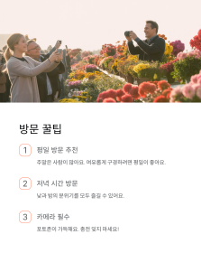 입구에 들어서자마자 국화 향이 코끝을 자극할 정도로 진하게 퍼져있대요. 저도 작년에 다녀왔었는데, 정말 향기가 장난 아니더라고요. 향수 뿌린 것처럼 옷에도 향이 배어서 집에 갈 때까지 국화 향을 맡을 수 있었어요.