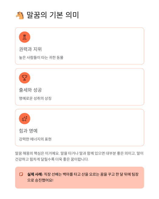 말꿈 해몽의 핵심은 이거예요. 말을 타거나 말과 함께 있으면 대부분 좋은 의미고, 말이 건강하고 힘차게 달릴수록 더욱 좋은 꿈이랍니다. 제 직장 선배는 백마를 타고 산을 오르는 꿈을 꾸고 한 달 뒤에 팀장으로 승진했다고 하더라고요!
