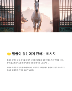 말꿈 해몽을 참고하시되, 꿈은 어디까지나 무의식의 메시지예요. 꿈의 긍정적인 에너지를 받아 현실에서도 자신감 있게 도전하고 노력하는 게 진짜 성공의 비결이랍니다. 말처럼 당당하고 힘차게 앞으로 나아가세요!