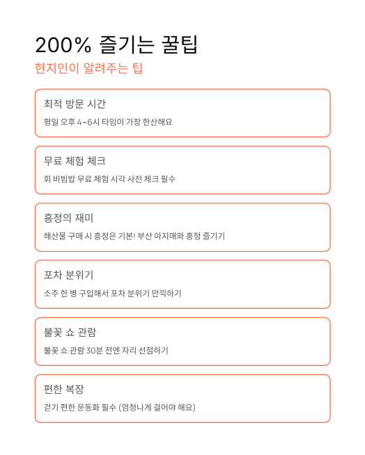 ✅ 날짜: 10/23~10/26 (총 4일) ✅ 위치: 자갈치시장·유라리광장 ✅ 비용: 전액 무료! ✅ 별미: 회 비빔밥, 생물회, 해물 구이 ✅ 명물: 바다 불꽃쇼 ✅ 이동: 지하철 자갈치역 하차