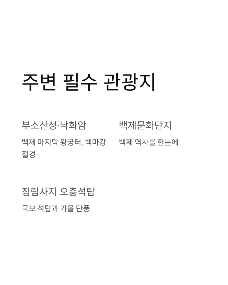 부소산성과 낙화암도 꼭 가봐야 할 곳이에요. 백제 마지막 왕궁터가 있는 부소산성을 걸으며 역사의 숨결을 느낄 수 있어요. 낙화암에서 바라보는 백마강 풍경은 정말 아름다워요.