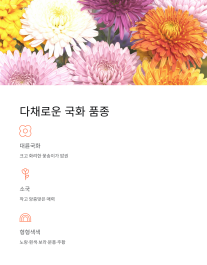 국화 종류도 정말 다양해요. 우리가 흔히 아는 노란색, 흰색 국화부터 보라색, 분홍색, 주황색 등 형형색색의 국화들이 있어요. 크고 화려한 대륜국화부터 작고 앙증맞은 소국까지 다양한 품종을 만날 수 있어요.