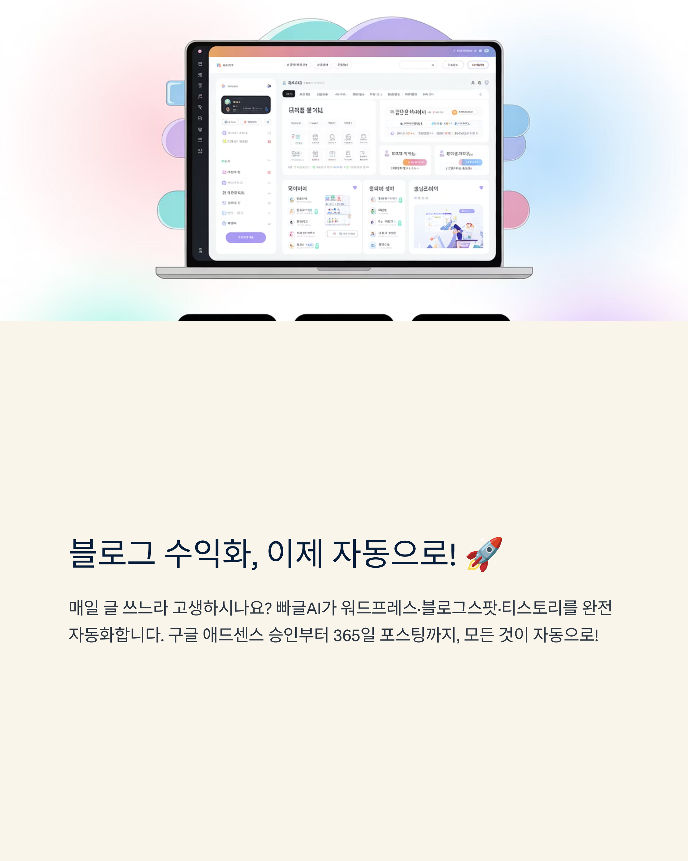 빠글AI는 워드프레스·블로그스팟·티스토리를 지원하는 구글 애드센스 블로그 자동화 서비스입니다. 가제트 AI팀이 야심차게 준비한 '빠른 글쓰기' 솔루션으로, 블로그 운영의 모든 과정을 자동화해줍니다.