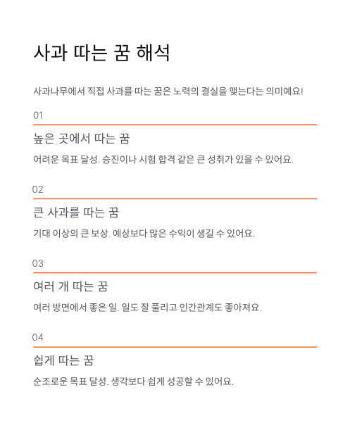 - 여러 개의 사과를 따는 꿈: 여러 방면에서 좋은 일이 생겨요. 일도 잘 풀리고 인간관계도 좋아지는 등 전반적으로 운이 상승해요.
