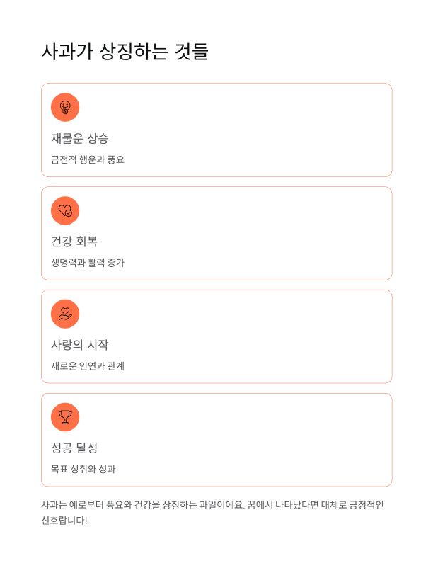 꿈에서 사과가 나타났다면 대체로 긍정적인 신호예요! 특히 탐스럽고 싱싱한 사과일수록 좋은 의미를 담고 있답니다. 사과꿈해몽의 기본 의미는 다음과 같아요.