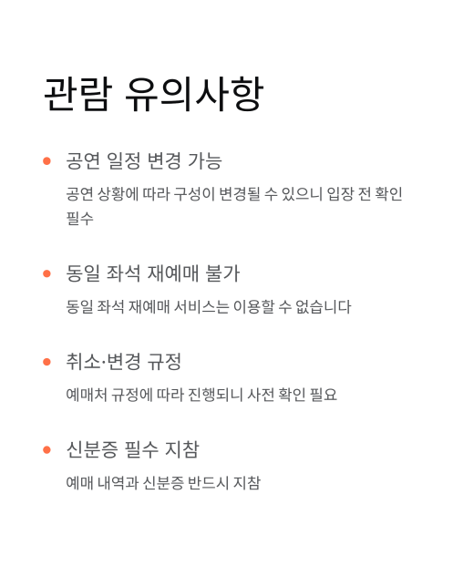 티켓 예매 시 공연 안내사항에 동의한 것으로 간주됩니다. 공연 일정, 구성 등은 공연 상황에 따라 변경될 수 있으니 입장 전 반드시 확인해주세요.