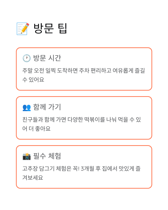여러분은 순창 떡볶이 페스타에 가보셨나요? 가장 맛있었던 떡볶이는 뭐였는지 댓글로 공유해주세요! 다음 글에서는 '순창 여행 코스 추천'으로 찾아올게요. 떡볶이 페스타와 함께 즐길 수 있는 순창의 숨은 명소들을 소개해드릴게요! 🌶️