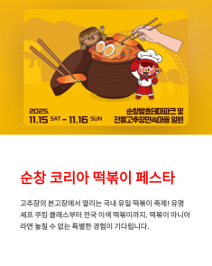 고추장의 고장 순창에서 열리는 국내 유일의 떡볶이 축제, 순창 코리아 떡볶이 페스타! 유명 셰프의 쿠킹 클래스부터 전국 이색 떡볶이 맛집까지, 떡볶이 마니아라면 절대 놓칠 수 없는 축제가 열려요. 작년보다 더 업그레이드된 2025년 페스타는 어떤 특별함이 기다리고 있을까요?