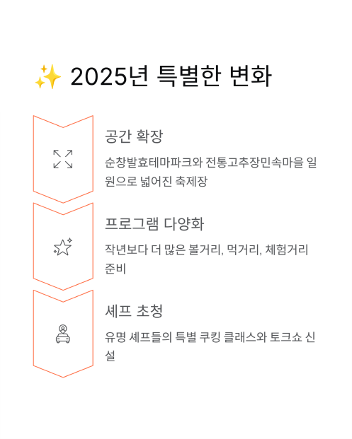 올해는 작년보다 더 업그레이드됐어요. 순창발효테마파크는 물론 전통고추장민속마을까지 공간을 확장했거든요. 그만큼 더 많은 볼거리와 먹거리, 체험거리가 준비되어 있답니다!