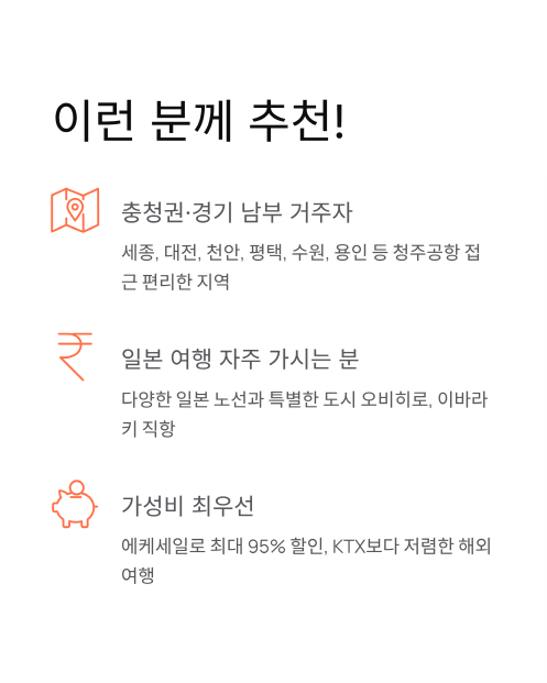 ✔️ 충청권, 세종, 대전, 천안 거주자 ✔️ 경기 남부 (평택, 수원, 용인 등) ✔️ 일본 여행 자주 가시는 분 ✔️ 가성비 최우선 ✔️ 오비히로, 이바라키 등 특별한 일본 여행
