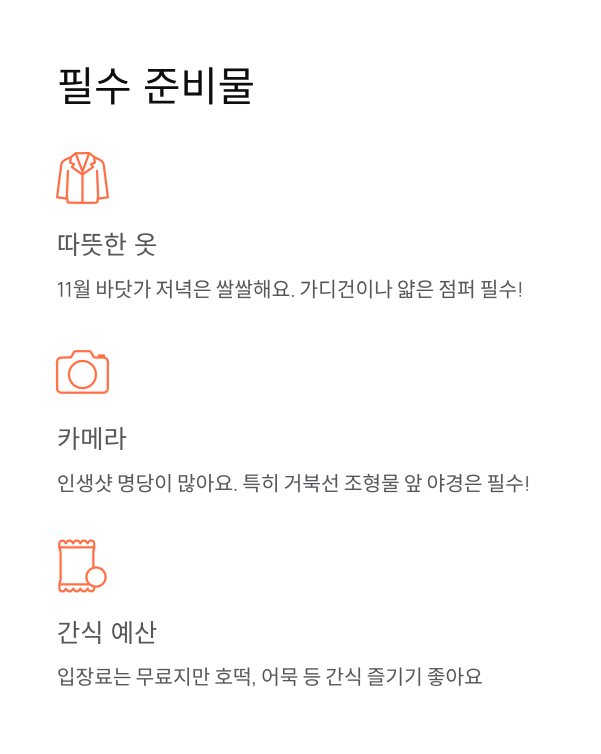 11월 초라서 날씨가 제법 쌀쌀할 수 있으니까 가디건이나 얇은 점퍼 하나 챙기시는 걸 추천해요. 하지만 추위도 잊게 만드는 멋진 순간들이 기다리고 있을 거예요!