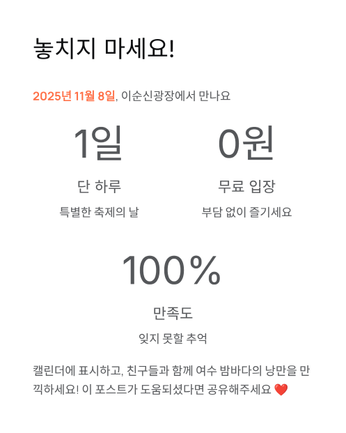 여수밤바다 축제가 드디어 돌아옵니다! 올해는 2025년 11월 8일 단 하루만 열려요. 짧지만 강렬한 이 축제, 놓치면 1년을 기다려야 한다는 거 아시죠?