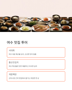 축제 전후로 여수 맛집 투어도 추천드려요. 특히 선어시장 근처에는 싱싱한 해산물 요리를 즐길 수 있는 식당들이 많아요. 서대회, 돌산갓김치, 게장백반... 생각만 해도 침 고이네요.