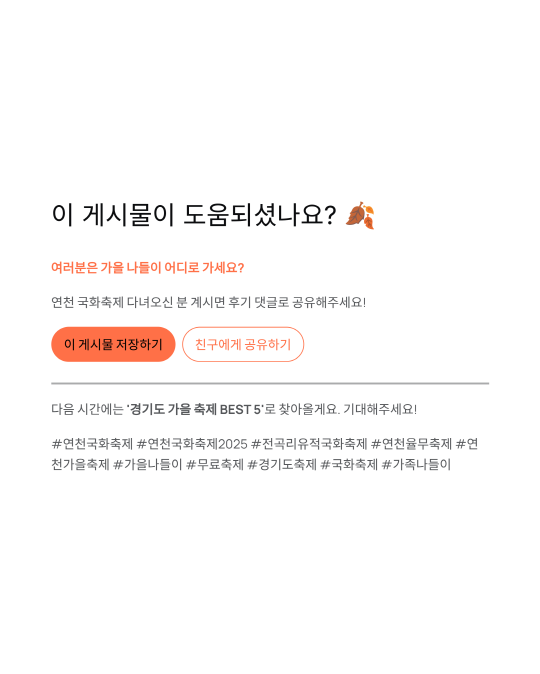 여러분은 가을 나들이 어디로 가세요? 연천 국화축제 다녀오신 분 계시면 후기 댓글로 공유해주세요! 다음 시간에는 '경기도 가을 축제 BEST 5'로 찾아올게요. 기대해주세요! 🍂