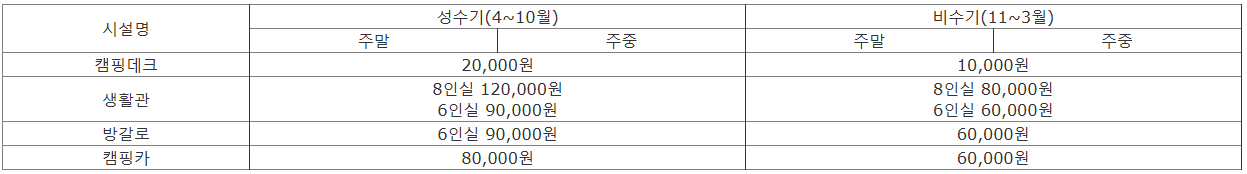 이용 제한: 3박 4일 이상 장기 이용 불가, 성수기 단체 예약 불가 (개인·가족 단위만 가능).
