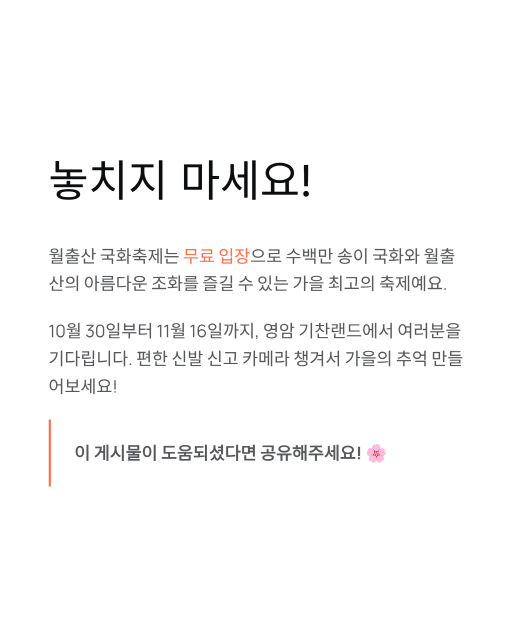 제가 갔을 때는 월출산을 형상화한 대형 국화 조형물이 정말 인상적이었어요. 사진 찍기 좋은 포토존도 여러 곳 마련돼 있어서 인스타그램 감성 사진 건지기 딱 좋아요!