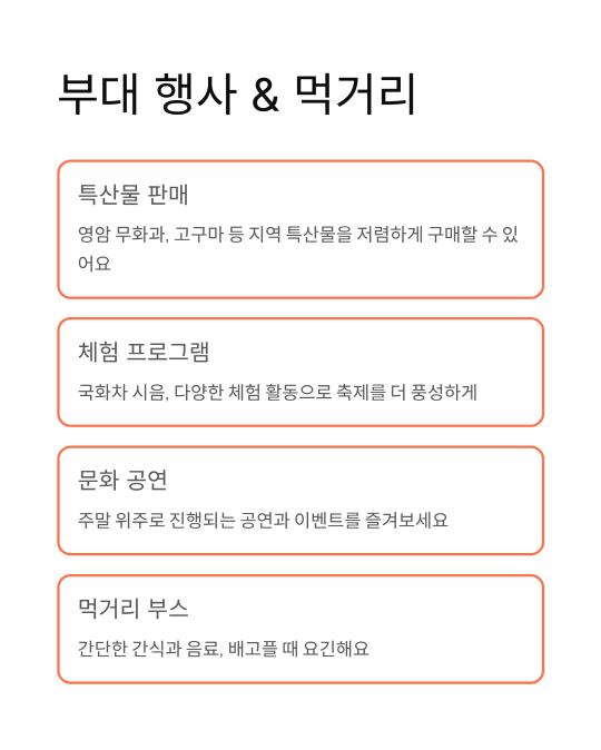 월출산을 배경으로 펼쳐지는 국화 정원이 정말 장관이에요. 도심 속 축제와 달리 자연과 어우러진 풍경이 인상적이에요. 가을 단풍과 국화가 함께 어우러져 사진 찍기도 딱 좋아요.