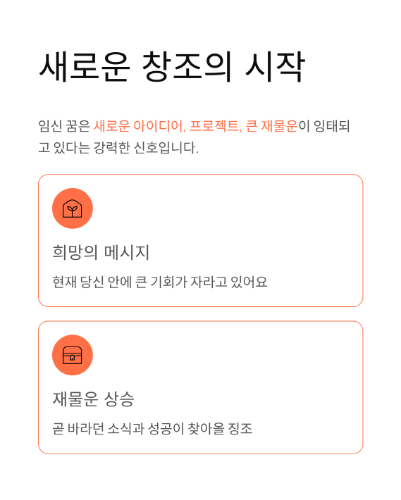 - 핵심 의미: 임신은 **잉태된 기회**를, 출산은 **결실과 성공**을 상징하는 최고의 길몽입니다.