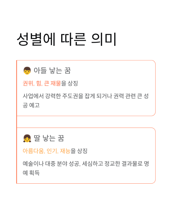 - 태몽의 구분: 아들은 **권력과 큰 사업**, 딸은 **인기와 섬세한 재능**을 가진 자녀를 예고할 수 있습니다.