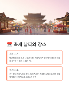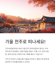 전주비빔밥축제는 10월 24~26, 3일간 진행되며, 가을 날씨가 선선해서 야외 축제를 즐기기에 딱 좋은 시기랍니다.