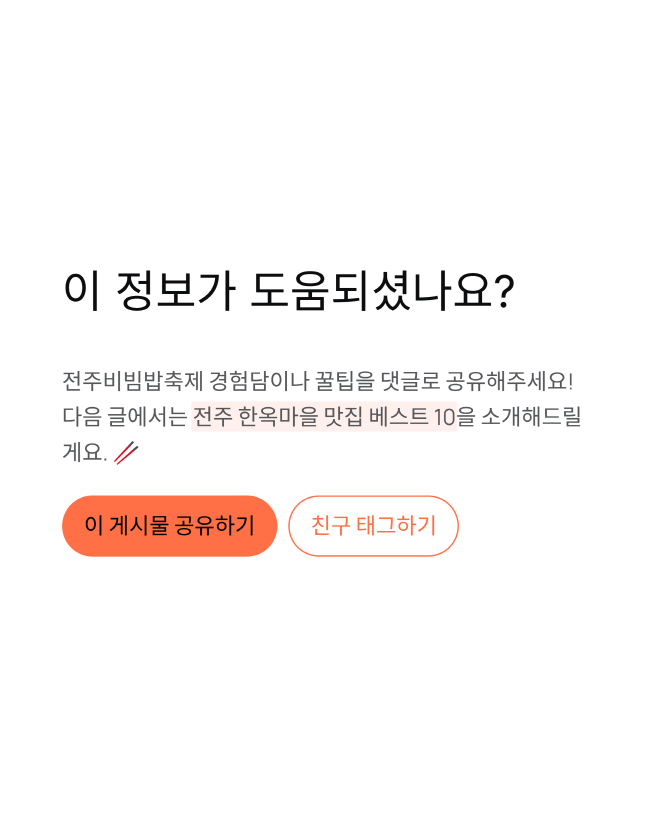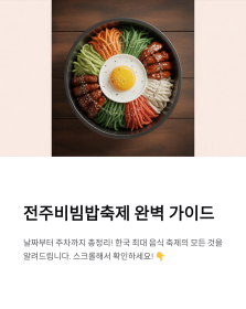 여러분은 전주비빔밥축제에 다녀오신 적 있나요? 가장 기억에 남는 프로그램이나 꿀팁이 있다면 댓글로 공유해주세요! 🥢