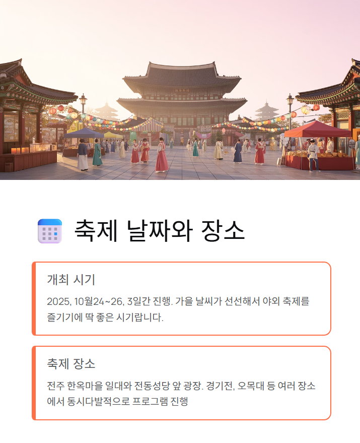 정확한 날짜는 매년 조금씩 달라지니까 전주시 공식 홈페이지나 축제 홈페이지에서 확인하는 게 좋아요. 보통 8~9월쯤 공지가 나온답니다.