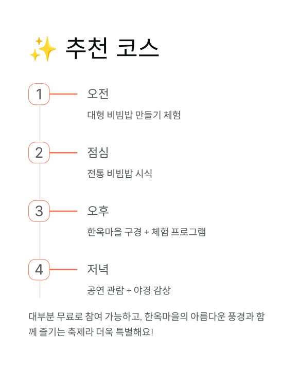 오전: 대형 비빔밥 만들기 체험 → 점심: 전통 비빔밥 시식 → 오후: 한옥마을 구경 + 체험 프로그램 → 저녁: 공연 관람 + 야경 감상