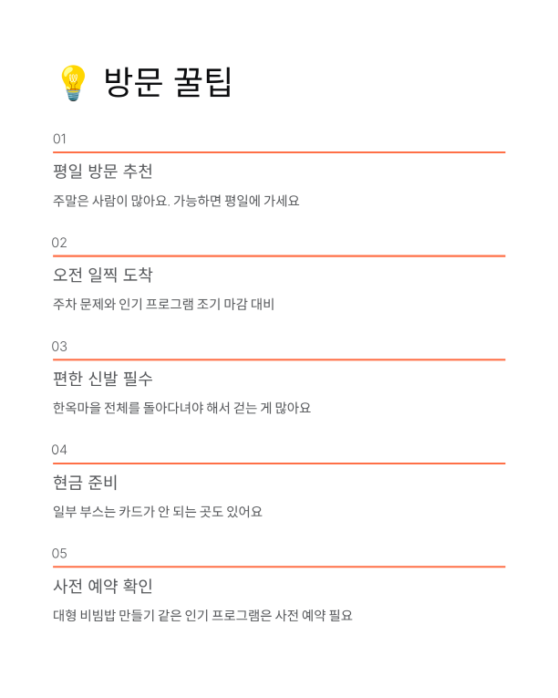 - 편한 신발 필수: 한옥마을 전체를 돌아다녀야 해서 걷는 게 많아요.