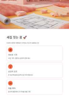 - 새집 짓는 꿈: 새로운 사업을 시작하거나 직장에서 큰 프로젝트를 맡아 **성공적으로 마무리**할 것을 암시합니다. 창의적인 활동에서 큰 이득을 얻을 수 있어요.
