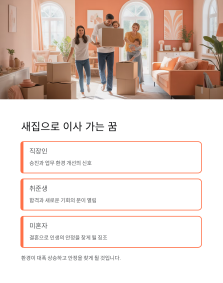 꿈에서 **이사**는 곧 현실에서의 **변화, 환경의 이동, 직업 변동**을 상징합니다. 중요한 것은 '어떤 곳으로' 이사를 가느냐입니다.