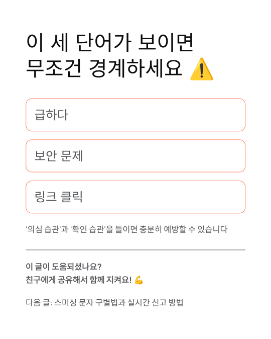 “급하다”, “보안 문제”, “링크 클릭” — 이 세 단어가 보이면 무조건 경계하세요 ⚠️