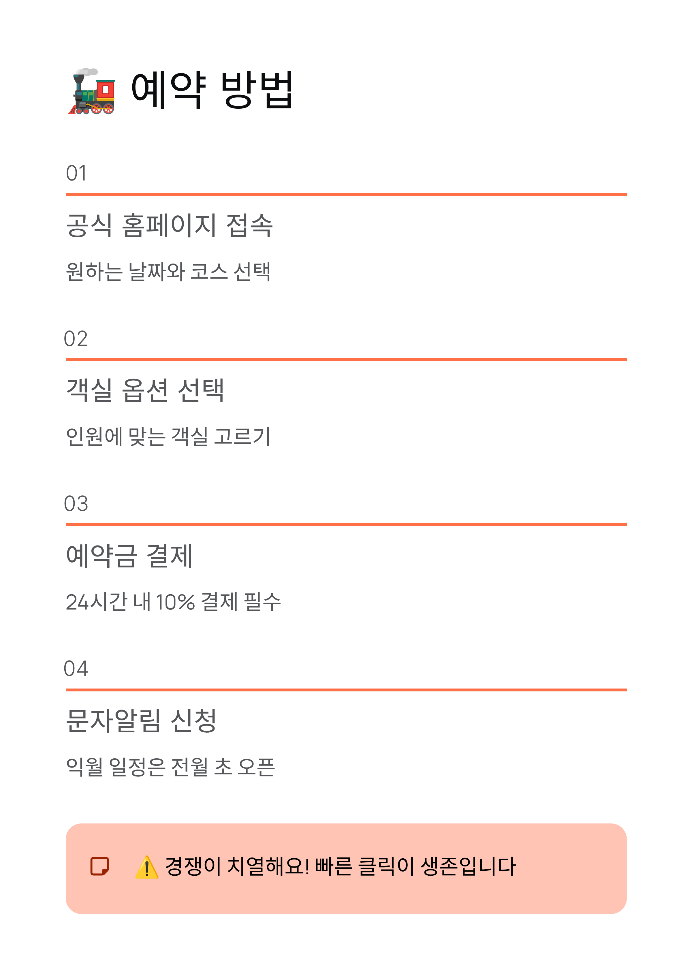 해랑열차는 공식 홈페이지에서만 예약이 가능합니다. 원하는 여행 날짜와 코스를 고른 뒤, 인원에 맞는 객실 옵션을 선택해 결제하면 끝! 예약 오픈은 익월 일정이 전월 초에 시작되니 문자알림 서비스를 꼭 신청하세요. 경쟁이 정말 치열해서 빠른 클릭이 생존입니다.