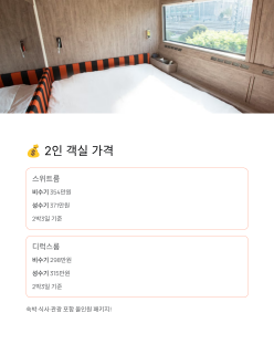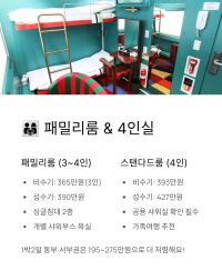 4인 기준 객실은 가족뿐 아니라 친구 여행에도 인기가 많아요. 단, 총 예약 객실이 10실 미만이면 운행이 취소될 수 있으니 예약 후 안내 문자를 꼭 확인하세요!