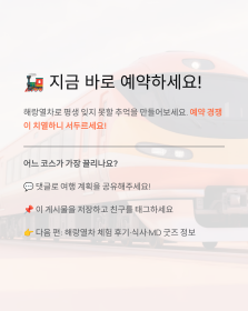 여러분은 해랑열차 어느 코스가 가장 끌리나요? 댓글로 여행 설계·궁금점을 직접 남겨주세요! 다음 포스팅에서는 해랑열차 체험 후기·식사·MD 굿즈 정보를 알차게 소개할게요~