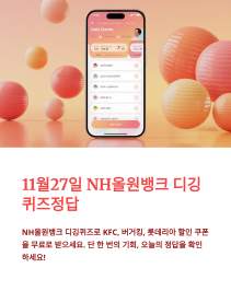 11월 27일 올원뱅크 디깅퀴즈 정답, 올원뱅크 퀴즈, 디깅퀴즈 정답, NH올원뱅크, 디깅퀴즈 쿠폰, KFC 쿠폰, 버거킹 쿠폰, 롯데리아 쿠폰, 올원뱅크 이벤트, 생활플러스