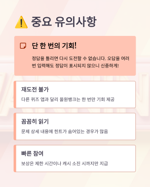 그래서 퀴즈 내용을 확인할 때는 반드시 상세 내용부터 꼼꼼하게 읽어보세요. 문제에 힌트가 숨어있는 경우도 많아요.
