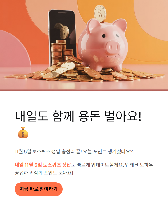 내일은 ‘11월 6일 토스퀴즈 정답’으로 돌아올 예정이니, 알람 설정해두고 함께 포인트 쌓아가요. 오늘도 행운 가득한 하루 되세요!