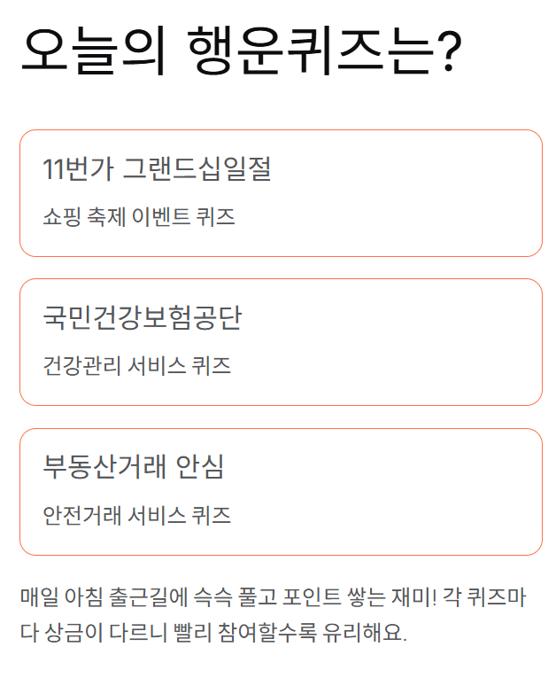 오늘도 토스 앱 켜자마자 퀴즈부터 찾으셨죠? 11월 5일 토스퀴즈 정답을 빠르게 확인하고 포인트를 챙길 시간이에요. 이번엔 11번가 그랜드십일절, 국민건강보험공단, 부동산거래 안심서비스까지 총 세 가지 퀴즈가 준비돼 있습니다. 각 이벤트별 정답과 함께 퀴즈 참여 꿀팁도 함께 정리했습니다.