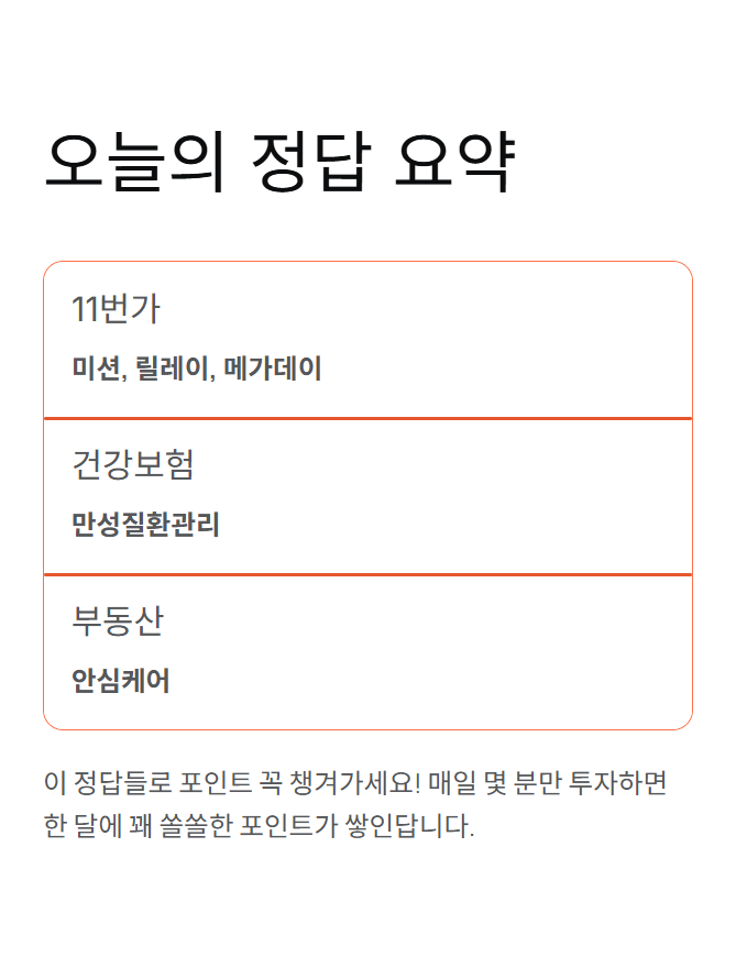 오늘 11월 5일 토스퀴즈 정답은 ‘미션, 릴레이, 메가데이’, ‘만성질환관리’, 그리고 ‘안심케어’였습니다.